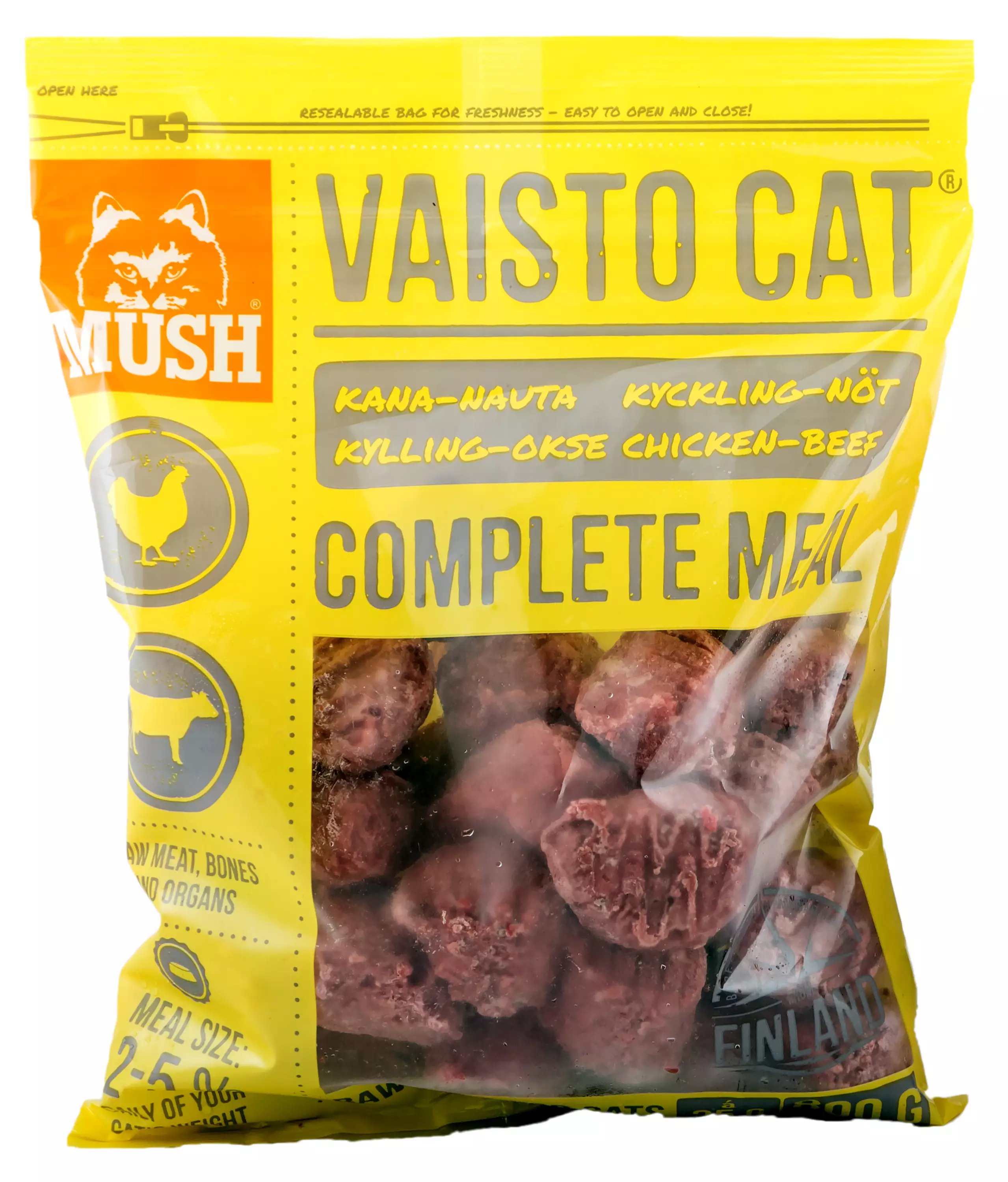 MUSH VAISTO CAT® on täysravinto kissoille.Se on kehitetty sinulle joka haluat antaa kissallesi lajityypillistä ruokaa ja olla varma siitä että kissasi saa kaiken tarvitsemansa ruoasta. Luuta 5 % ja maksaa 3 %. Vaisto CAT keltainen sopii niin kissanpennuille kuin aikuisille kissoille – myös tiineille kissaemoille. Se on erinomainen ruoka takaamaan parhaat mahdolliset lähtökohdat kasvuun ja terveelliseen elämään pienestä pitäen, ilman lisäaineiden aiheuttamaa kuormitusta keholle.