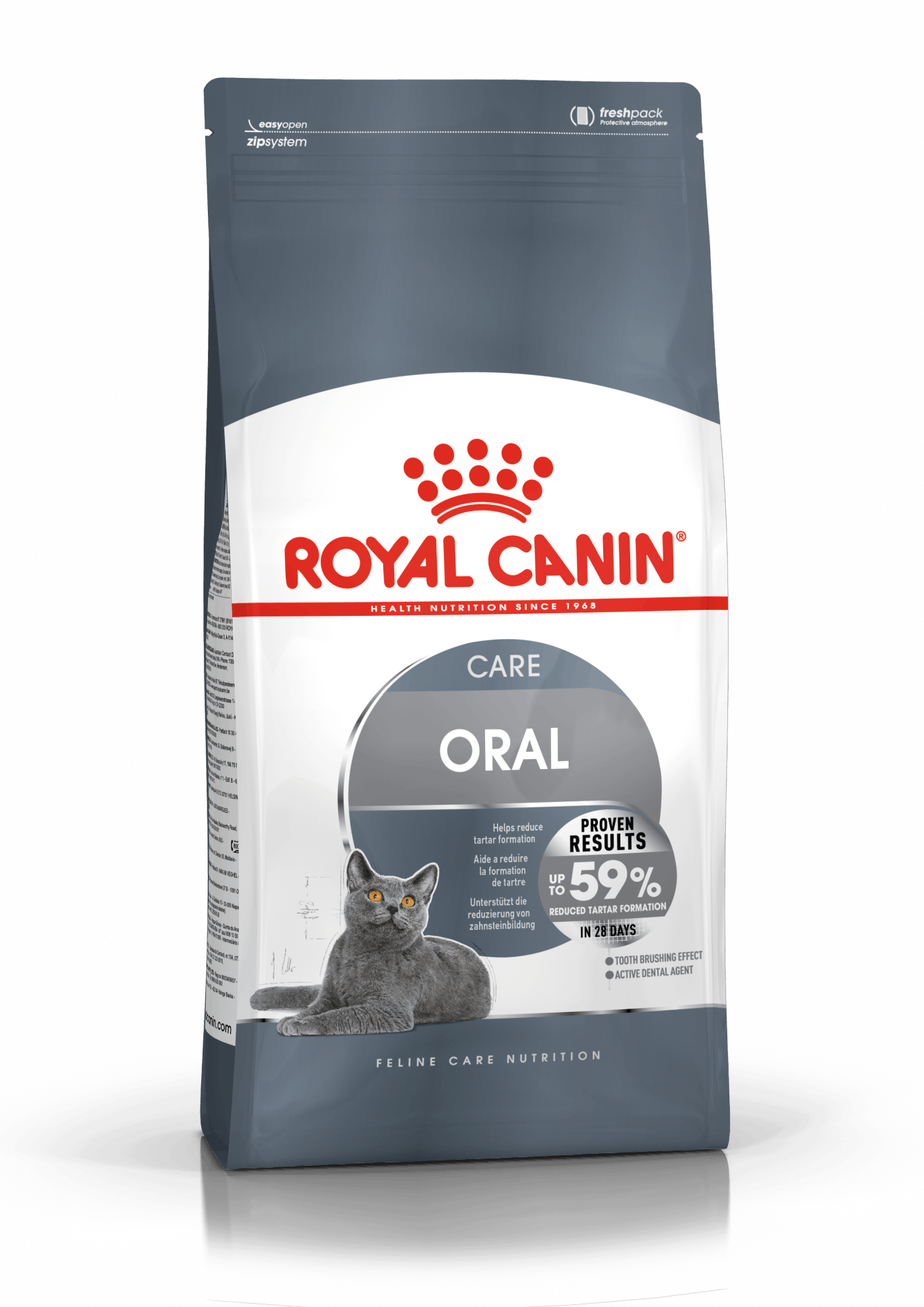ROYAL CANIN® Oral Care on tarkasti tasapainotettu ravintokoostumus, joka auttaa ylläpitämään kissasi suun terveyttä vähentämällä plakin muodostumista. Se sisältää myös runsaasti proteiinia tukemaan ja vahvistamaan kissan lihaksia, luita ja hampaita. Kun etsit ruokavaliota, joka hyödyttää kissan hampaita ja suun läheisyyttä, on tärkeää tietää, että ROYAL CANIN® Oral Care suorittaa kaksi toimintoa: Mekaaninen ja Chemical. ROYAL CANIN® Oral Care on suunniteltu erityisesti kohdennettuun toimintaan. Oral Care -palan koko, rakenne ja muoto kannustavat kissoja pureskelemaan perusteellisesti. Tämä mekaaninen toiminta tuottaa päivittäisen hampaiden harjausvaikutuksen, joka auttaa vähentämään plakin muodostumista hampaille. Tämä kaava on myös rikastettu "aktiivisella hammaslääkeaineella" (kalsiumkelaattoreita), joka suorittaa kemiallisen toiminnan vangitsemalla syljen kalsiumia ja auttaa rajoittamaan plakin mineralisaatiota. ROYAL CANIN® Oral Care on kliinisesti todistettu näyttävän tuloksia jo 28 päivän jatkuvan käytön jälkeen, mikä vähentää hammaskiven muodostumista jopa 59 %.