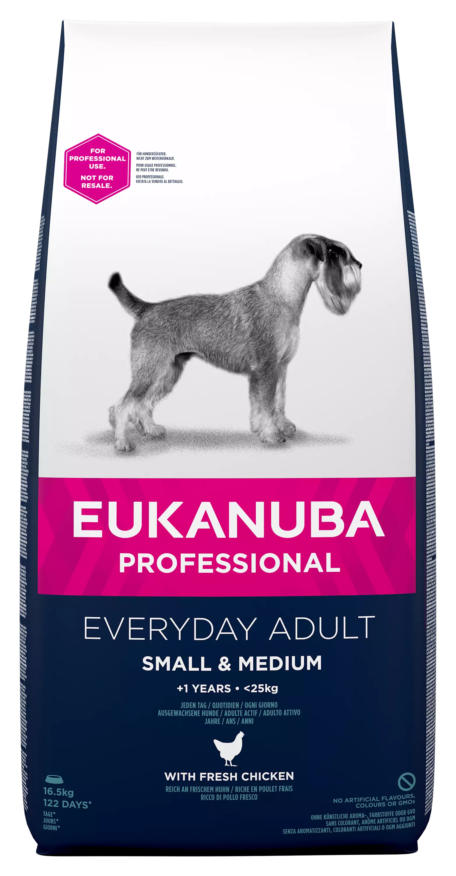 Koirasi on paras ystäväsi joka tilanteessa. Siksi se ansaitsee laadukasta ravintoa, joka auttaa sitä pysymään erityisenä – joka päivä. EUKANUBAn runsaasti kanaa sisältävä aikuisten ruoka on juuri oikea ravinto pienille ja keskikokoisille koirille, joilla on herkkä iho tai -vatsa, ja jotka haluavat toimia normaalin koiran tavoin. Helposti sulavat ainesosat auttavat koiraasi voimaan hyvin. Tämän lisäksi prebiootit ja juurikasmassa pitävät ruoansulatuksen aktiivisena ja terveenä., Ensisijainen proteiinin lähteemme on kana, joka on luonnollinen elementti lihaa syövien koirien ruokavaliossa. Tämä auttaa rakentamaan vahvat ja kiinteät lihakset ja vastaamaan kaikkiin haasteisiin yhteisissä seikkailuissanne. Kalsium vahvistaa luita ja kliinisesti todettu antioksidantti vahvistaa luontaista vastustuskykyä, mikä pitää koirasi aktiivisena ja urheilullisena. Haluat tietenkin, että paras ystäväsi tuntee olonsa hyväksi ja näyttävän upealta, ja tämä aikuisten koirien ruoka sisältää ihanteellisessa suhteessa omega-6- ja omega-3-rasvahappoja. Ne edistävät ihon terveyttä ja turkin kiiltoa ja auttavat myös vähentämään karvanlähtöä jopa 80 % (tulokset saattavat vaihdella)., eukanuban runsaasti kanaa sisältävä ravinto pienten ja keskikokoisten rotujen aikuisille koirille käyttää 3D dentadefense -teknologiaa, joka puhdistaa koirasi hampaat jokaisella puraisulla, vähentää hammaskiven muodostumista jopa 80 % (tulokset saattavat vaihdella) ja auttaa pitämään koiran hampaat vahvoina. Tämä pienten ja keskikokoisten rotujen ruoka on kehitetty yhdessä eläinlääkäreiden kanssa ja se on huippukasvattajien suosittelemaa. 100-prosenttisen täydellinen ja tasapainoinen ruoka saa parhaan ystäväsi tuntemaan olonsa hyväksi vaikka se olisi herkkäihoinen ja -vatsainen, ja auttaa jaksamaan paremmin – joka päivä., Erityisesti herkkäihoiset ja -vatsaiset pienet ja keskikokoiset koirat kuten mäyräkoirat, colliet, mopsit ja cockerspanielit saavat kaiken tarvitsemansa eukanuban runsaasti kanaa sisältävästä pienten ja keskikokoisten rotujen koirille tarkoitetusta ravinnosta.