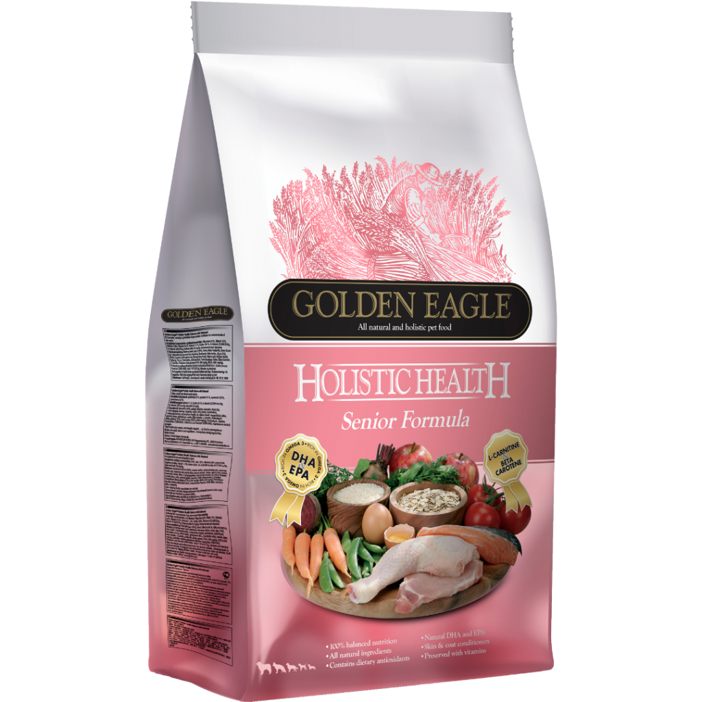 Golden Eagle Holistic Senior Formula on luonnollinen, holistinen ja vehnätön koiran senioriruoka. Golden Eagle Holistic Senior Formula -koiranruoka sisältää valikoituja, korkealaatuisia proteiini- ja hiilihydraattilähteitä sekä terveellisiä kasviksia ja hedelmiä ilman kemiallisia säilöntä-, maku- tai väriaineita. Vähemmän rasvaa, enemmän lihaproteiineja vanhenevan koiran erityistarpeisiin. Ei sisällä vehnää, soijaa eikä maissia. Vähennetty rasvan määrä ehkäisee lihomista samalla kun korkea proteiinimäärä ylläpitää lihasmassaa. Sisältää ainutlaatuiset holistiset pre- ja probiootti lisäravinteet BioHealth™ and LactoHealth™.
