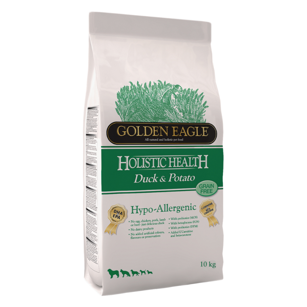 Golden Eagle Hypo-Allergenic Duck & Potato -koiranruoka on kehitetty koirille, jotka kärsivät allergiaoireista tai ravintoaineherkkyyksistä. Ankkapohjainen täysravinto ei sisällä yleisesti allergisoivia ainesosia.