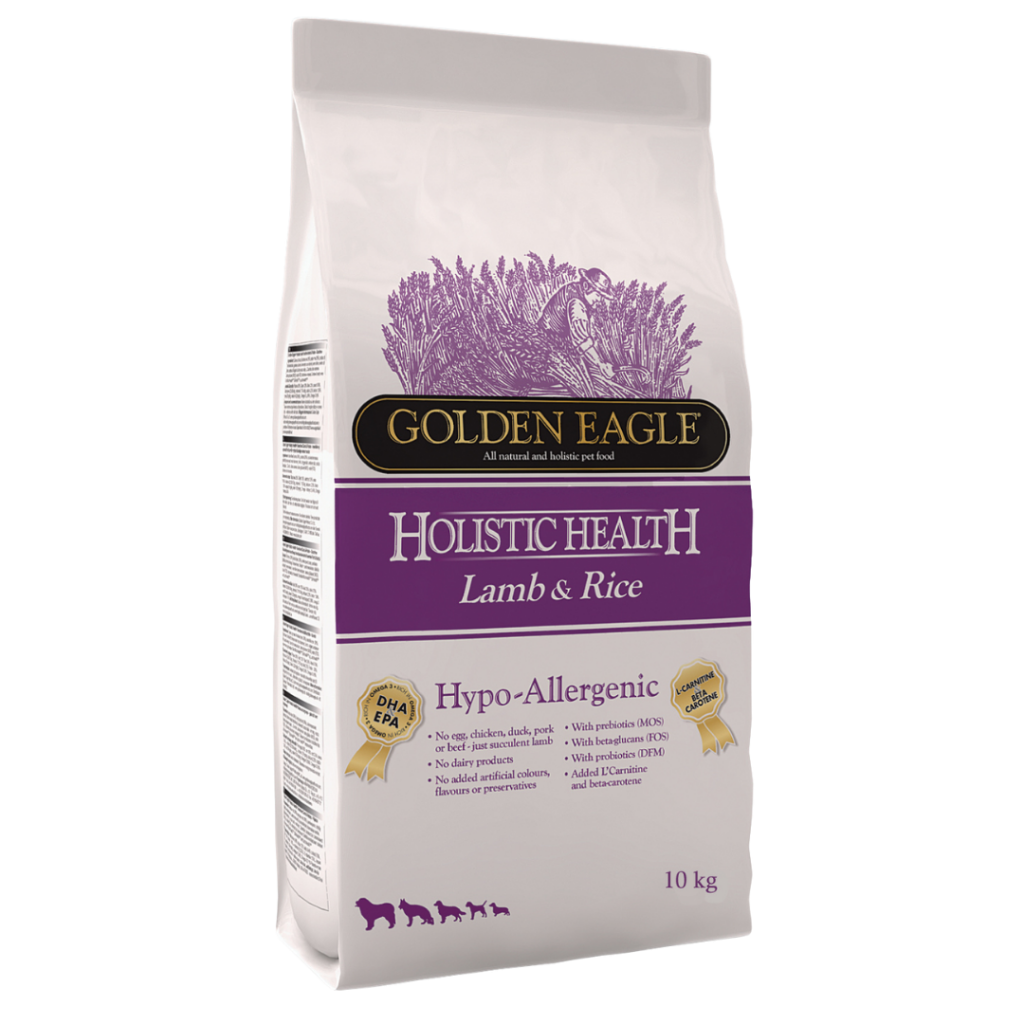 Golden Eagle Hypo-Allergenic Lamb & Rice on kehitetty koirille jotka kärsivät allergiaoireista ja ruoka-aine-herkkyyksistä. Suositellaan myös koirille jotka kärsivät suolistohäiriöistä, kuten hiivatulehduksista, ripulista tai paksusuolentulehduksesta. Golden Eagle Hypo-Allergenic -koiranruokasarja tukee koiran aineenvaihduntaa puhtaalla ja luonnollisella täysravinnolla, joka vastaa erilaisiin ravintovaatimuksiin. Viljaton koostumus, josta on karsittu yleisesti allergiaa aiheuttavat raaka-aineet sopivat monille ruoka-aineyliherkille koirille.