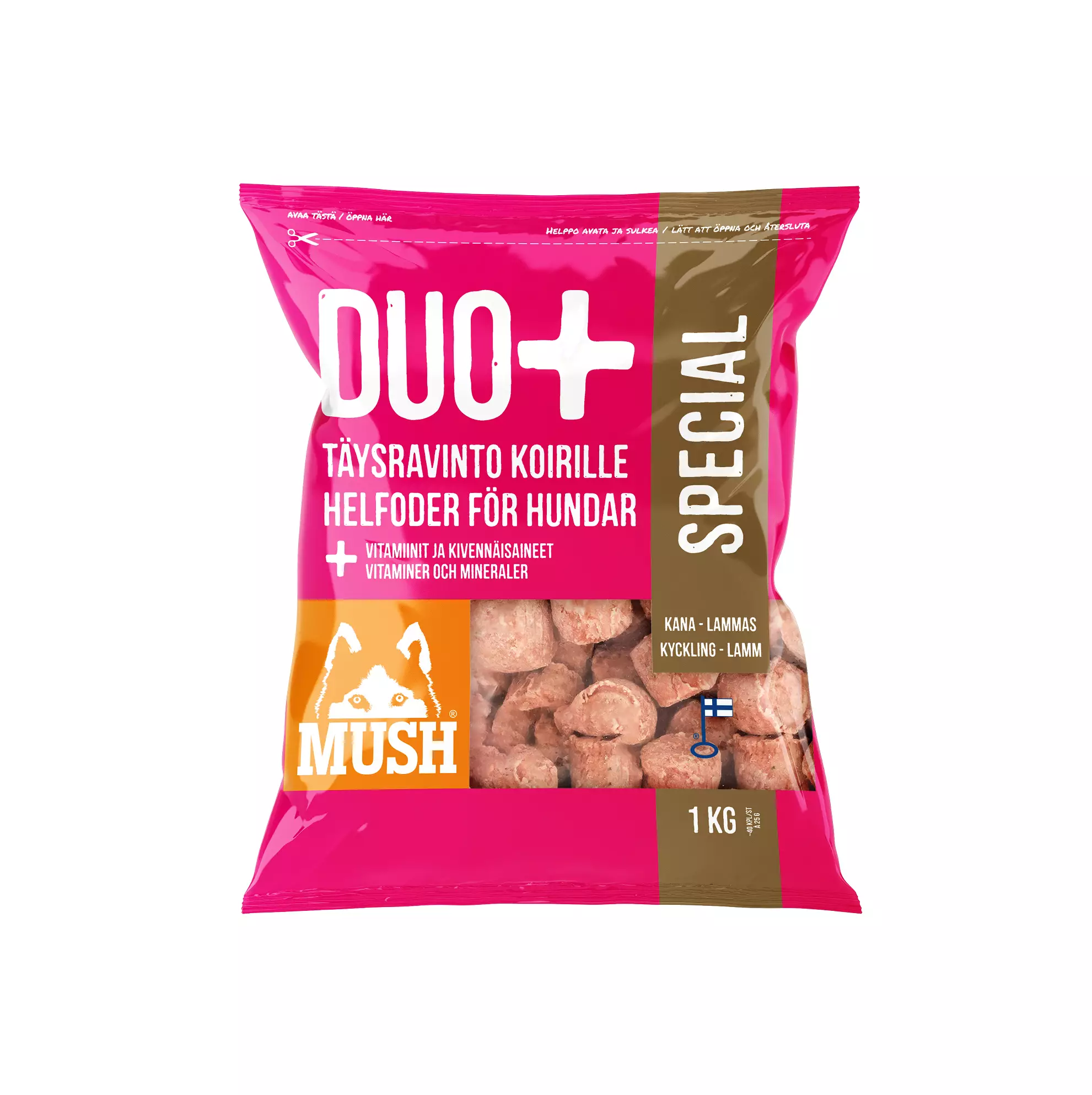 Etsitkö ravintoa, joka maistuu, sulaa hyvin ja täyttää jokaisen aikuisen koiran ravitsemukselliset tarpeet? Tässä se on: MUSH DUO+ Special – nimensä veroinen täysravinto, jossa yhdistyvät herkullinen kana ja ravinteikas lammas. Tämä kotimainen raakaruoka on suunniteltu niin pienille kuin isoillekin tassuttelijoille. DUO+ Special sopii kaikille roduille ja on luonnollinen valinta koiranruokintaan – ilman viljoja, ilman turhaa kikkailua. Vain lihaa, vihreää ja hyvää oloa. Kana tuo mukaan hyvin sulavaa proteiinia, ja lammas tuo lisää makua sekä monipuolisuutta. Parsakaali, jäävuorisalaatti ja pinaatti tuovat vitamiineja luonnollisessa muodossa – ja mukana on myös kananmunaa ja laadukkaita kylmäpuristettuja öljyjä tukemaan koiran kokonaisvaltaista hyvinvointia.