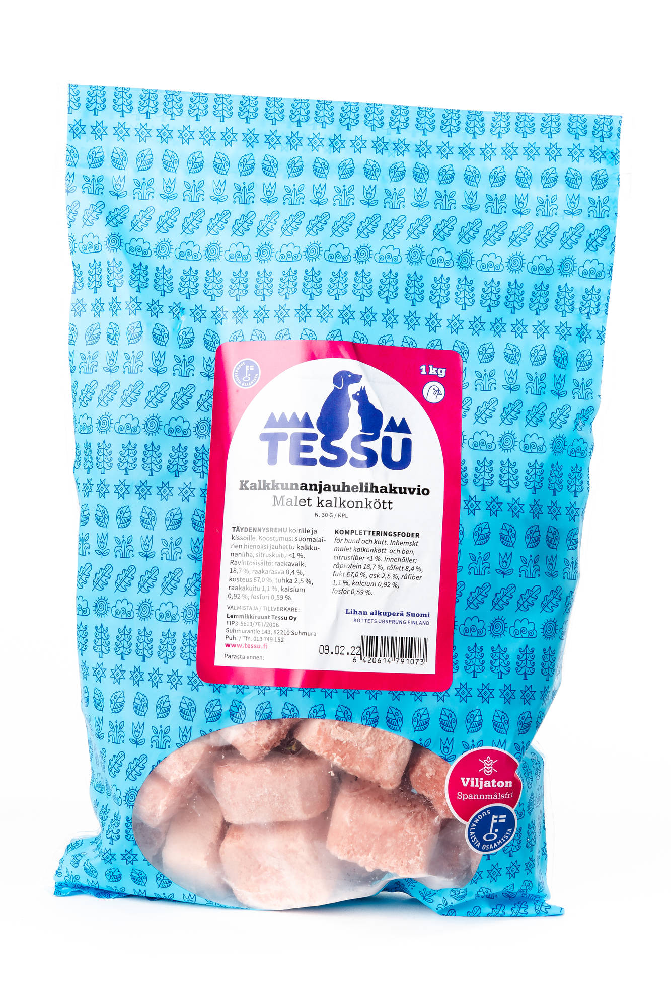 Raakapakaste jauhetusta kalkkunanlihasta uudelleensuljettavassa pussissa. Näppärän kokoinen kotimainen luuton kalkkunanjauhelihakuvio (n. 30 g/ yksittäinen kuvio) on helposti sulava herkkuateria. Se sopii myös mainiosti kissoille.